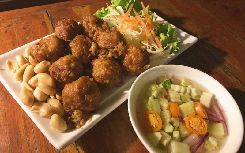 – ตั้งกระทะสำหรับทอดแล้วเทน้ำมันลงไป เปิดไฟให้พอร้อนโดยหรี่เป็นไฟอ่อน นำหมูที่หมักไว้ใช้ช้อนสองคนปั้นเป็นก้อนกลม ๆ ขนาดเหรียญบาท แล้วนำลงไปทอดในกระทะ ค่อย ๆ กลับไปมา พอเหลืองแล้วตักขึ้นพักให้สะเด็ดน้ำมัน