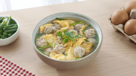 - เติมน้ำเปล่าลงไปในกระทะใบเดิม แล้วใส่รากผักชี กระเทียม พริกไทยเม็ดลงไป พอน้ำเดือดให้คุณปั้นหมูสับที่หมักไว้เป็นก้อนกลม ลงต้มพอสุก แล้วใส่เกลือป่น ยืนคอยช้อนฟองออกเพื่อความใสน่ากินของน้ำซุป